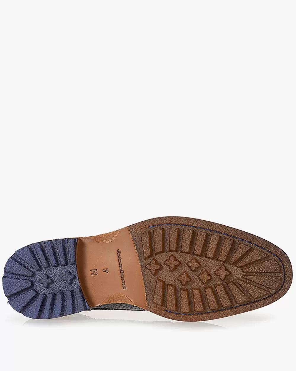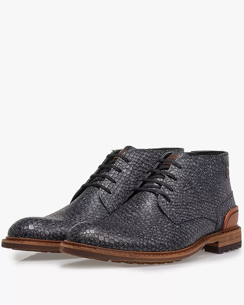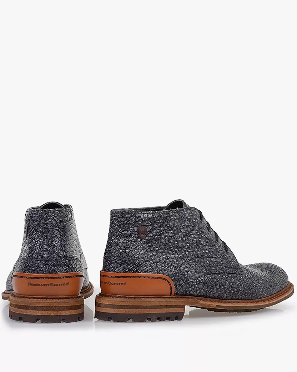 This casual all-round boot is chic and sporty at the same time. The last looks slim, but offers plenty of space for a solid foot thanks to its H-width. The leather of the sole edge and heel has a matte finish. The outsole has a durable commando profile that tapers towards the forefoot. The back of the boot has a heel cap made from extra durable vegetable tanned leather, sporting the laser-cut Floris van Bommel logo. The boot is finished with premium calf leather lining. This version is made of dark grey printed leather.