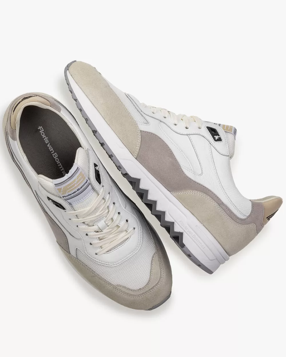 A new design for the summer of 2023: The ‘De Harder’ sneaker. The upper of this white grain leather sneaker combines with a sporty runner sole of considerable height. Since the sole doesn’t stick out much on the sides, this design has a slender look when worn. Floris van Bommel branding is added on various places on the shoe. The little FxB featured on the outsole is a small tribute to Floris’ great-great-grandmother after whom our shoe factory is named. Being illiterate, she used to sign documents with an x, and it’s that cross that became part of the small logo. This version features a fresh combination of off-white and white materials. The white part of the shoe is a mix of luxurious leathers, suedes, and fabrics.
