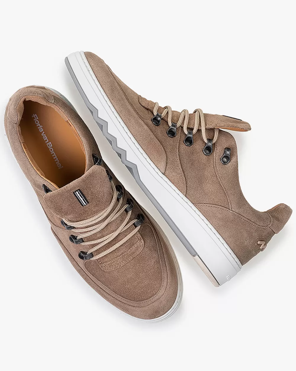 This is a casual sneaker. The side of the sole stands out thanks to the zig-zag line embedded in the tread. The sole is made of lightweight material and the outsole is made of durable TPU. The inside of the sneaker is finished with high-quality leather lining and a removable footbed. The hiking boot lacing gives the shoe a nice and casual look. This model comes in lightly oiled, light brown suede that stems from an Italian tannery in Santa Croce su’ll Arno, Pisa.
