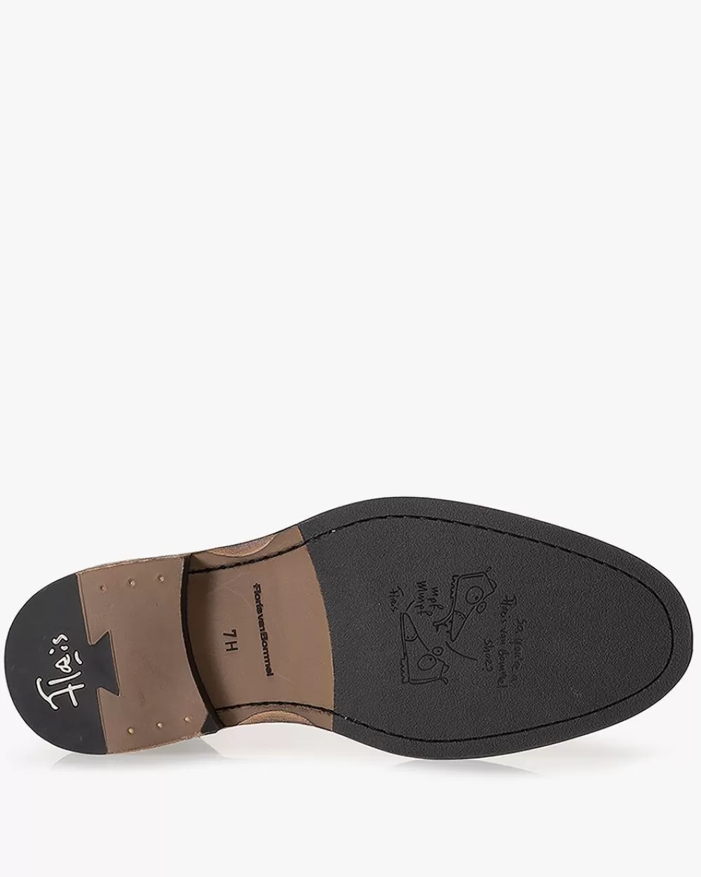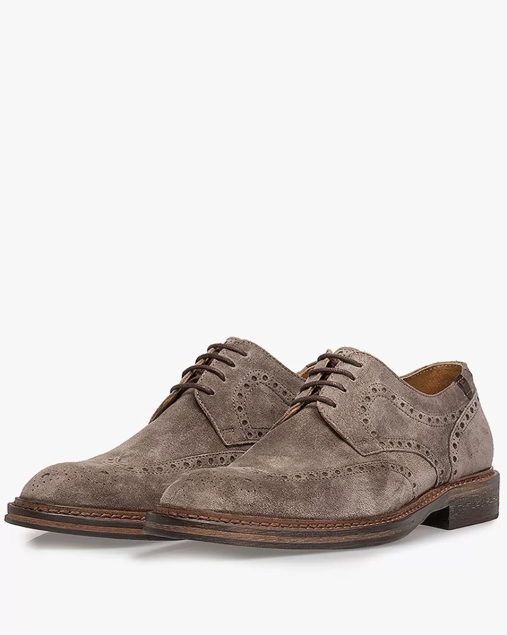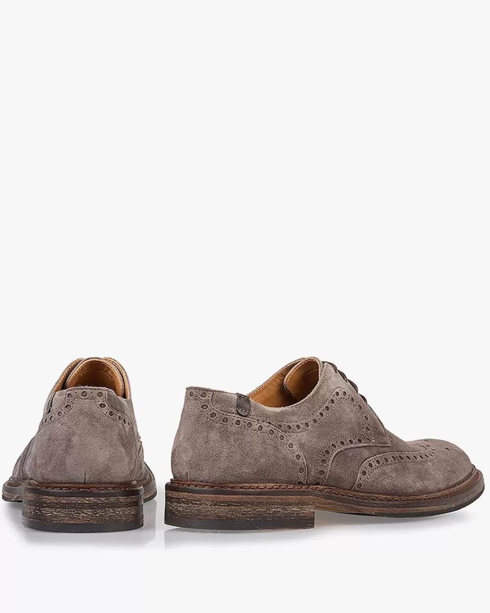 This is a winter derby brogue, finished in oiled taupe-coloured suede. The lightly oiled suede comes from a small Italian suede tannery in Santa Croce su’ll Arno, Pisa. The side of the sole is lightly roughened, giving the shoe a casual look. The sole tread is made of a sturdy, durable TPU material. This shoe has a comfortable last with an H-width, providing a wide fit range. The inside features honey-coloured calf leather lining. The shoe has a comfortable and easily removable footbed. In most cases, this offers enough space to insert custom insoles.