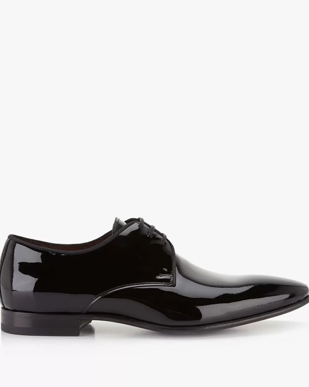 Elegant, black patent leather lace shoe with a tapered toe cap. The tuxedo shoe is finished with a leather lining and footbed.This article has been given a new article number. The old article number is 14338/00.