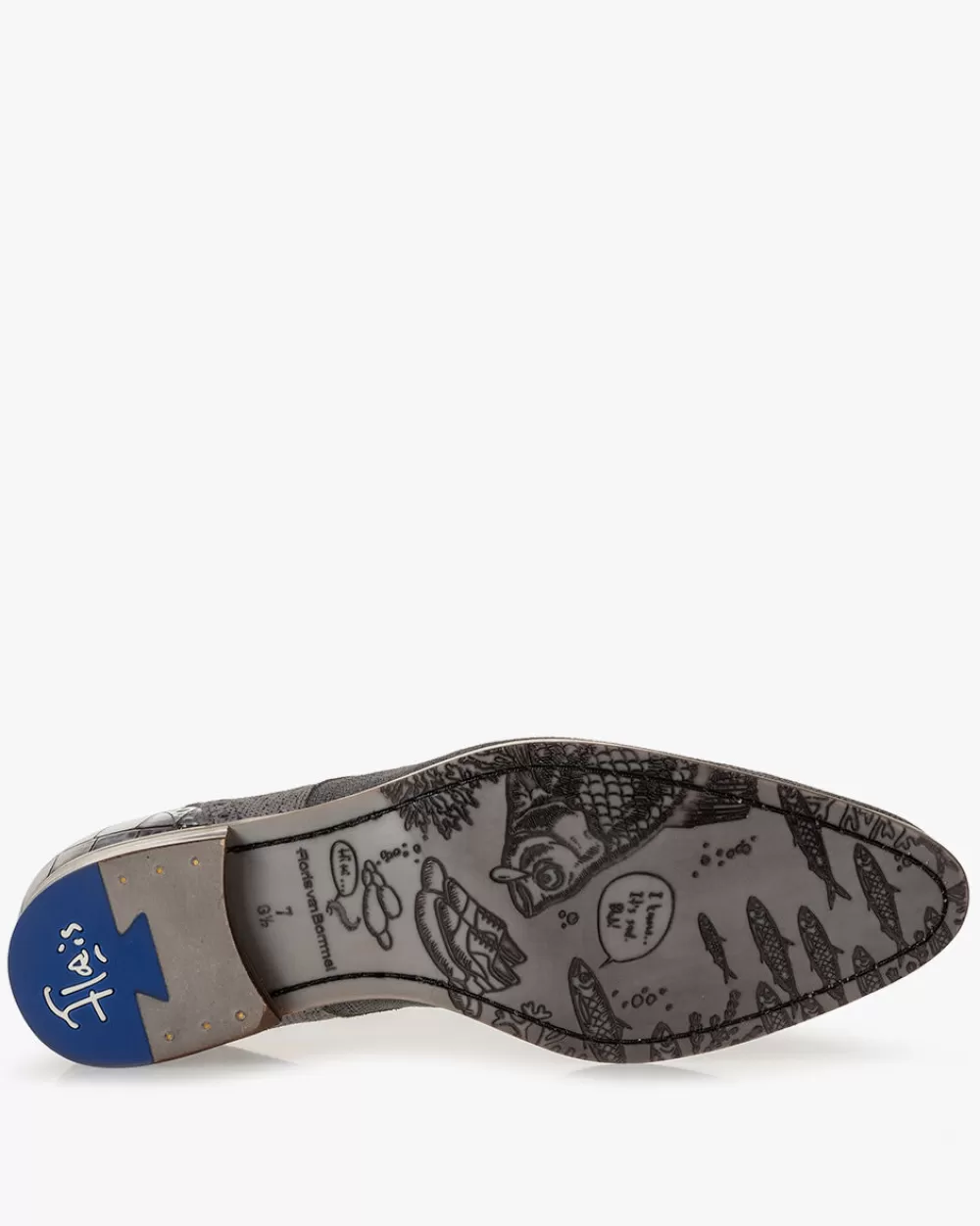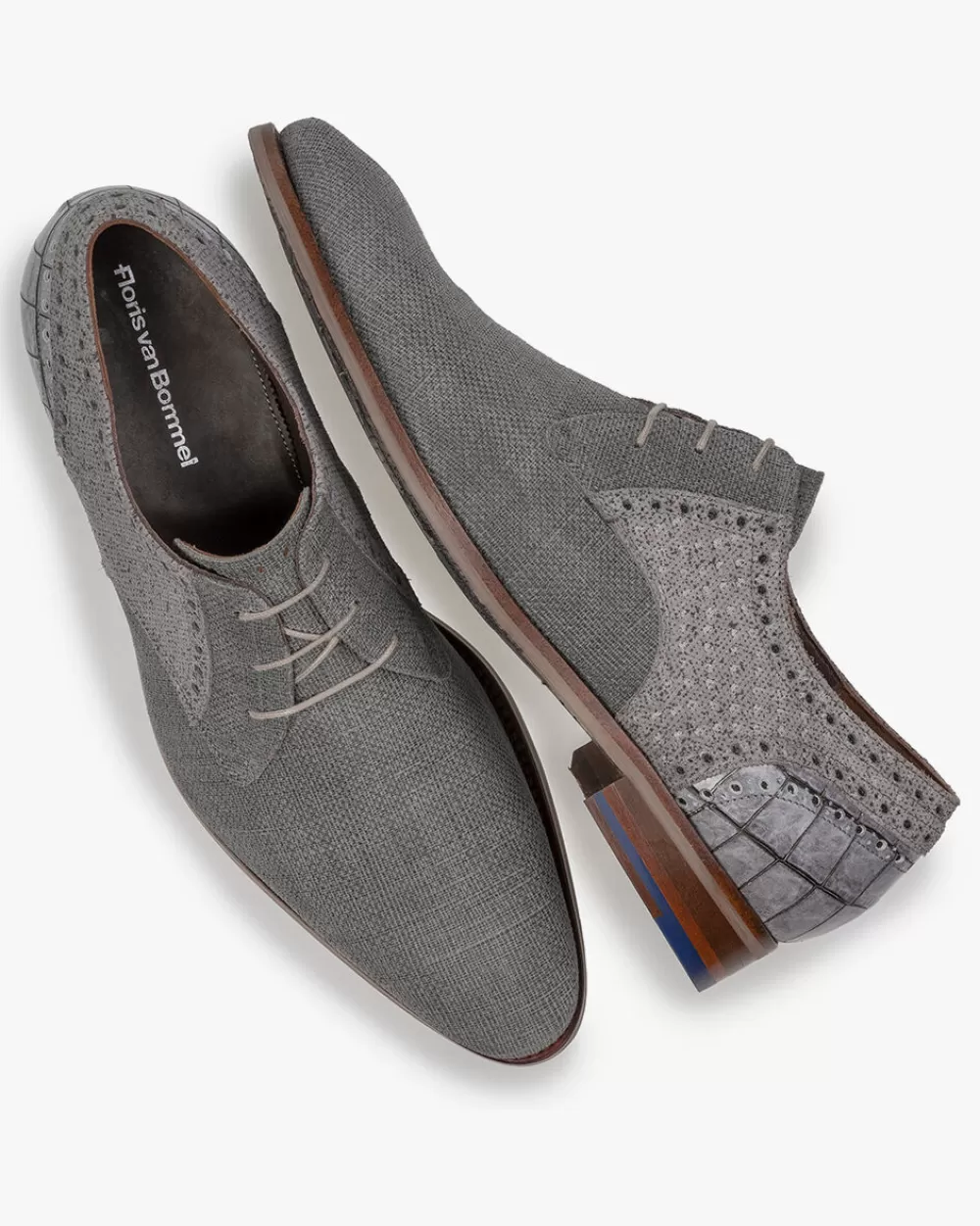 The upper of this shoe is made of 3 different types of leather. The front features grey suede with a geometric print. The side is made of lightly processed grey nubuck. The heel sports croco-print leather that is finished with a slightly washed look. This is a derby lace shoe with a durable grey TPU sole. An elegant dovetail joint divides the heel into a rubber part and a leather section. The inside of the shoe is finished with high-quality calf leather lining. The sole is stitched through in the typical Blake make.