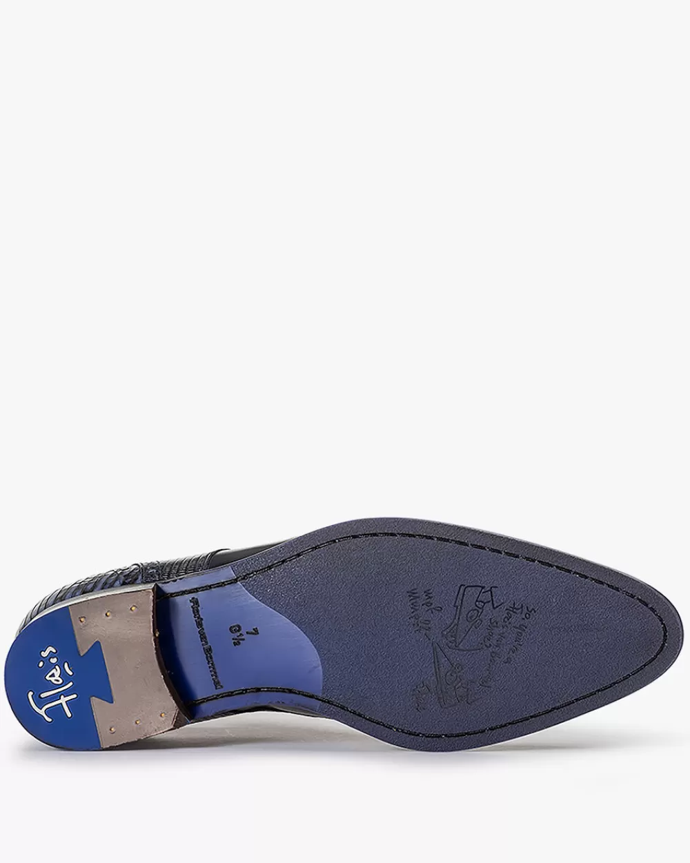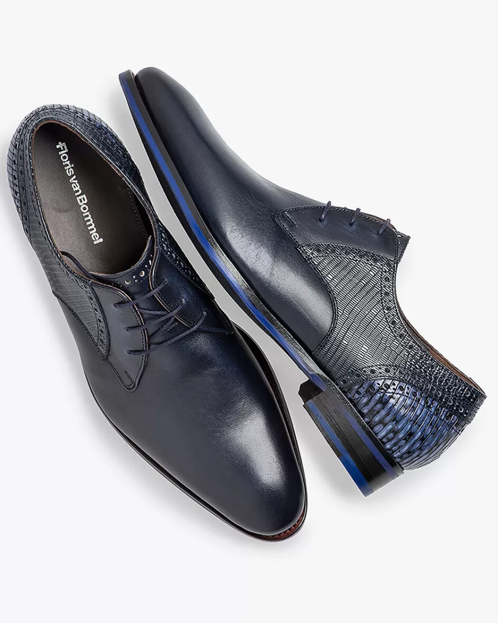 This shoe combines highly processed leathers. The vamp is made of dark blue calf leather. The derby lacing is suitable for any type of foot, but it offers slightly wider feet a little more room. The outsole is made of durable, grey TPU material. The layered leather heel is finished with a dovetail joint in the heel tip, adding a luxurious look. The inside is equipped with premium calf leather lining. The sole is stitched through to attach to the upper following the Blake method.