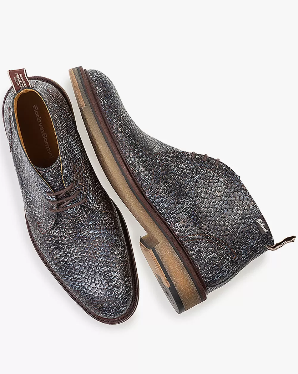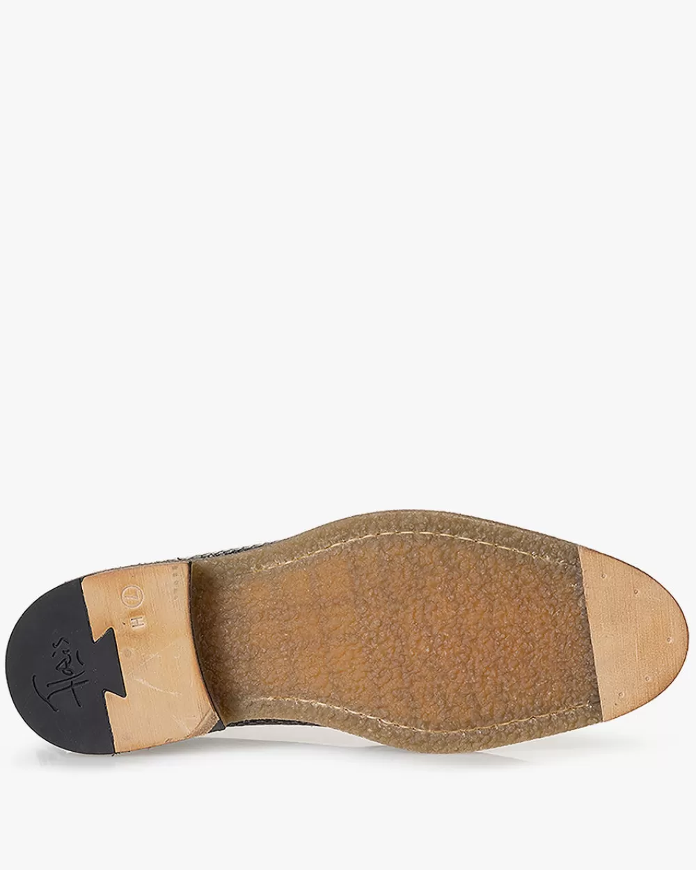 The sole of this casual boot looks like it is made of natural rubber, which is often referred to as a “crepe sole”. Real natural rubber is beautiful, but also pretty delicate. For this boot, we developed a special mix made of natural and synthetic rubber. This gives the Tanker’s sole the look of natural rubber, but it is as durable as synthetic rubber. The calf leather lining and carefully designed last provide long-lasting comfort. This leather undergoes several specialised treatments and is ultimately coloured by hand. First, the leather gets a multi-coloured digital print to create the base colour. The print is then finished with a scale relief print on top. This relief print is stained all black and washed off by hand immediately afterwards. Washing off the black coating creates a beautiful shadow effect in the deeper areas of the relief print.