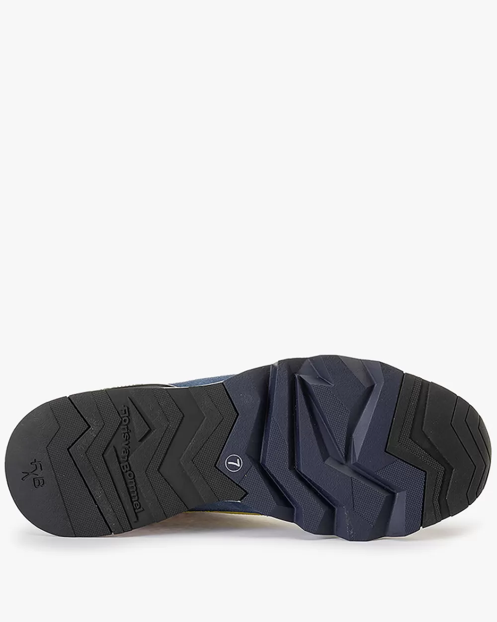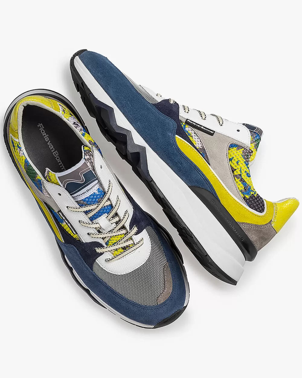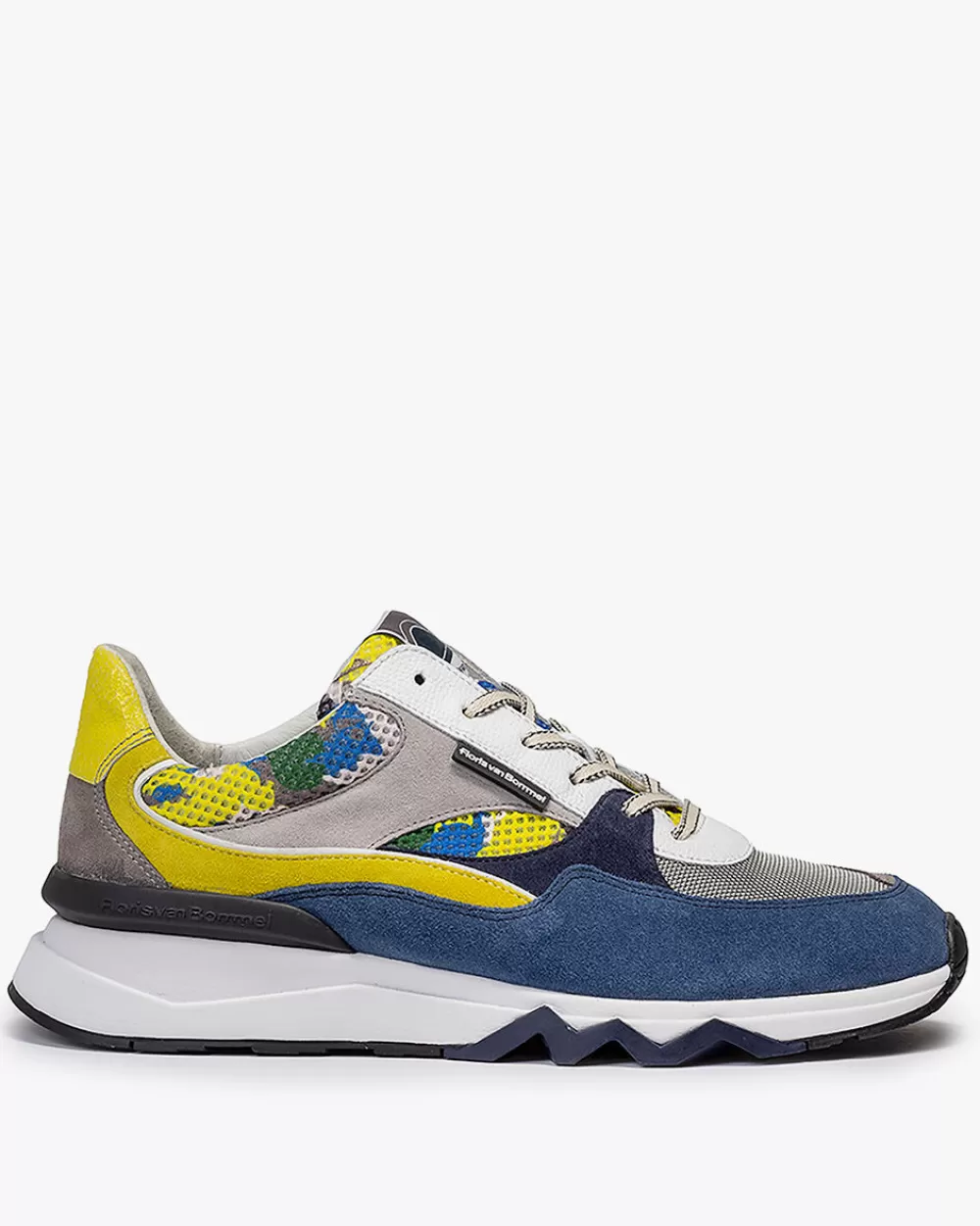 The sole of this new Zager (Sawyer), which is voluminous at the heel, tapers towards the forefoot, giving the shoe a speedy, sporty look. The sole is made of off-white and very light EVA material. The durable TPU outsole is adorned with the Floris van Bommel signature zig-zag line. The sneaker is finished with premium leather lining and a removable footbed. This model combines yellow and blue colours in textile/suede.