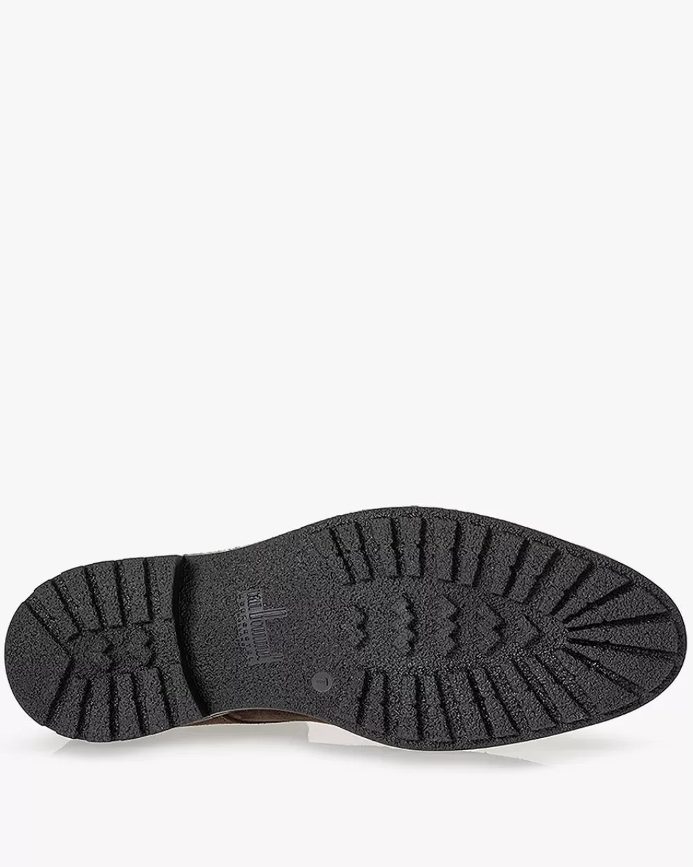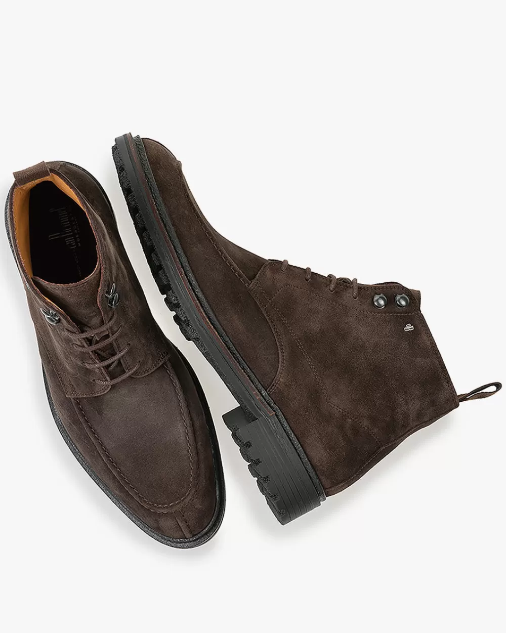 This boot is made of dark brown suede and is finished with drawstring stitching on the vamp. The sturdy rubber sole has a commando profile that is great for both indoor and outdoor wear. The sole is finished with an attractive inlayed leather sole border. The boot has an H-length last, which offers a wide fit range. The cotton pull loop at the heel allows for an easy on and off. The side panel is adorned with the classic metal VB logo punched into the suede. The boot is lined with high-quality calf leather for optimal moisture absorption and breathability. If needed, the removable footbed can easily be replaced with your own footbed or custom insoles.