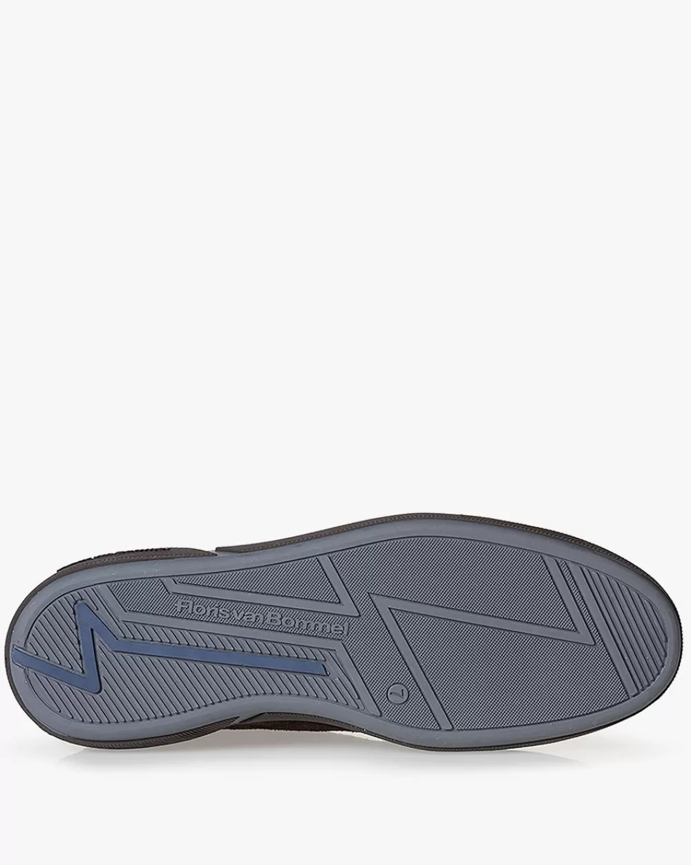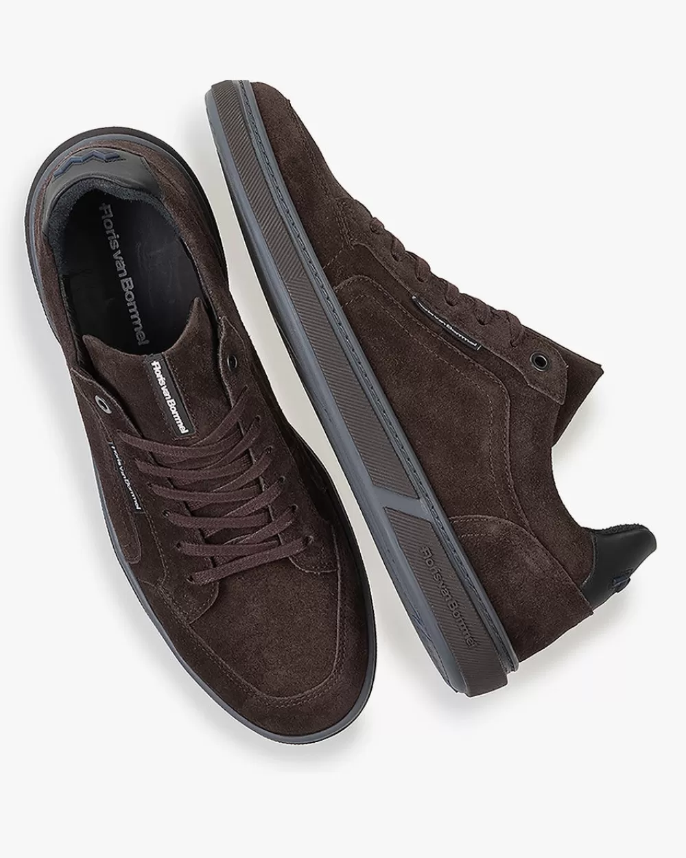 This casual shoe has a sporty dark blue sole. The side of the sole is finished with a black stripe. The design of the upper is kept nice and simple. The subtle sneaker trimlines combine with stylish suede, giving the model a chic and sporty shoe. The tongue and sides are finished with black labels sporting the Floris van Bommel logo in white letters. The shoe has premium leather lining and the leather-covered footbed is removable. This version is made of dark brown suede that stems from an Italian tannery specialising in suede in Santa Croce sull’arno, Pisa.