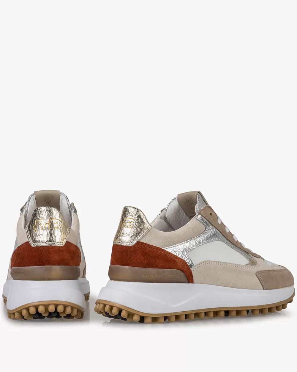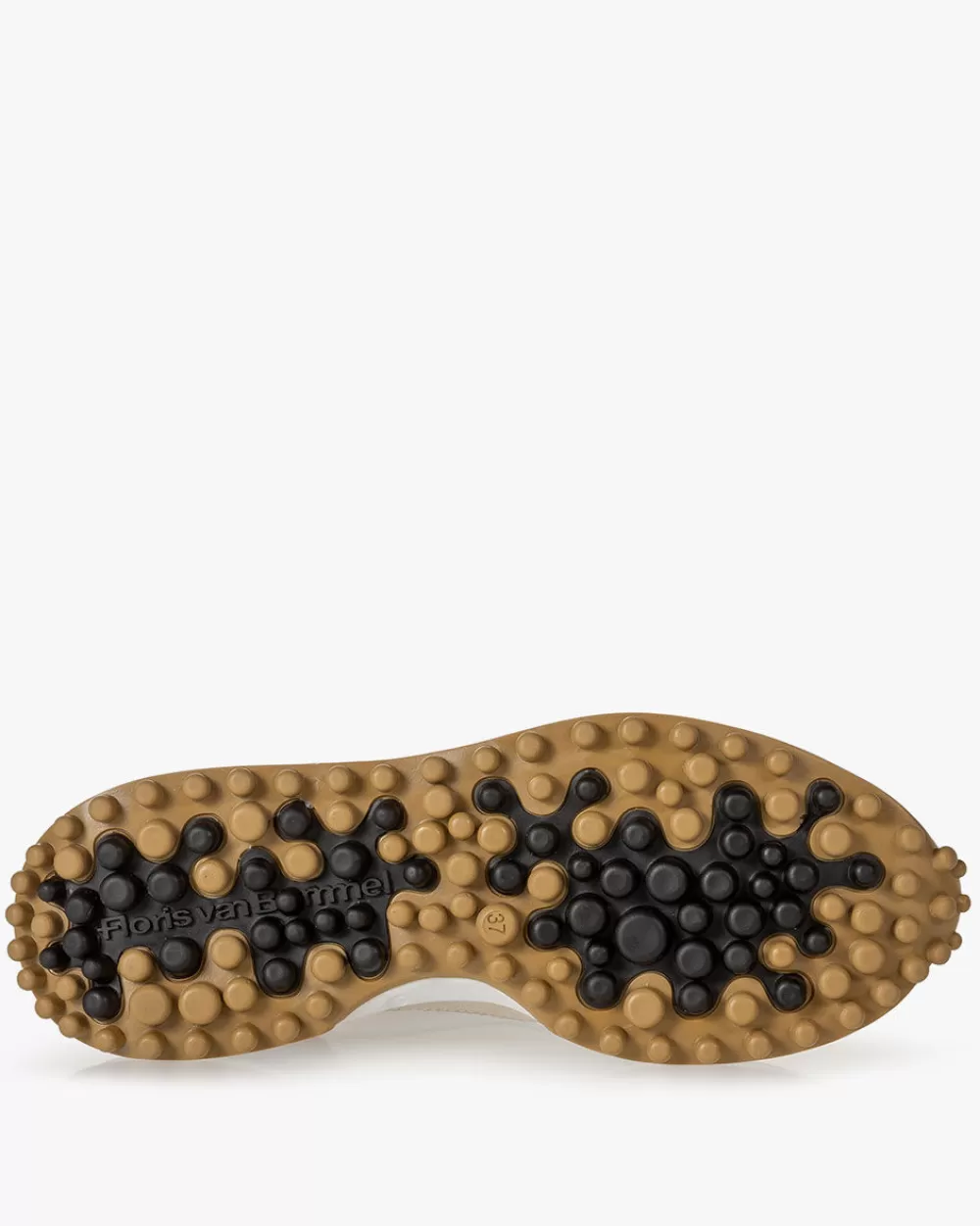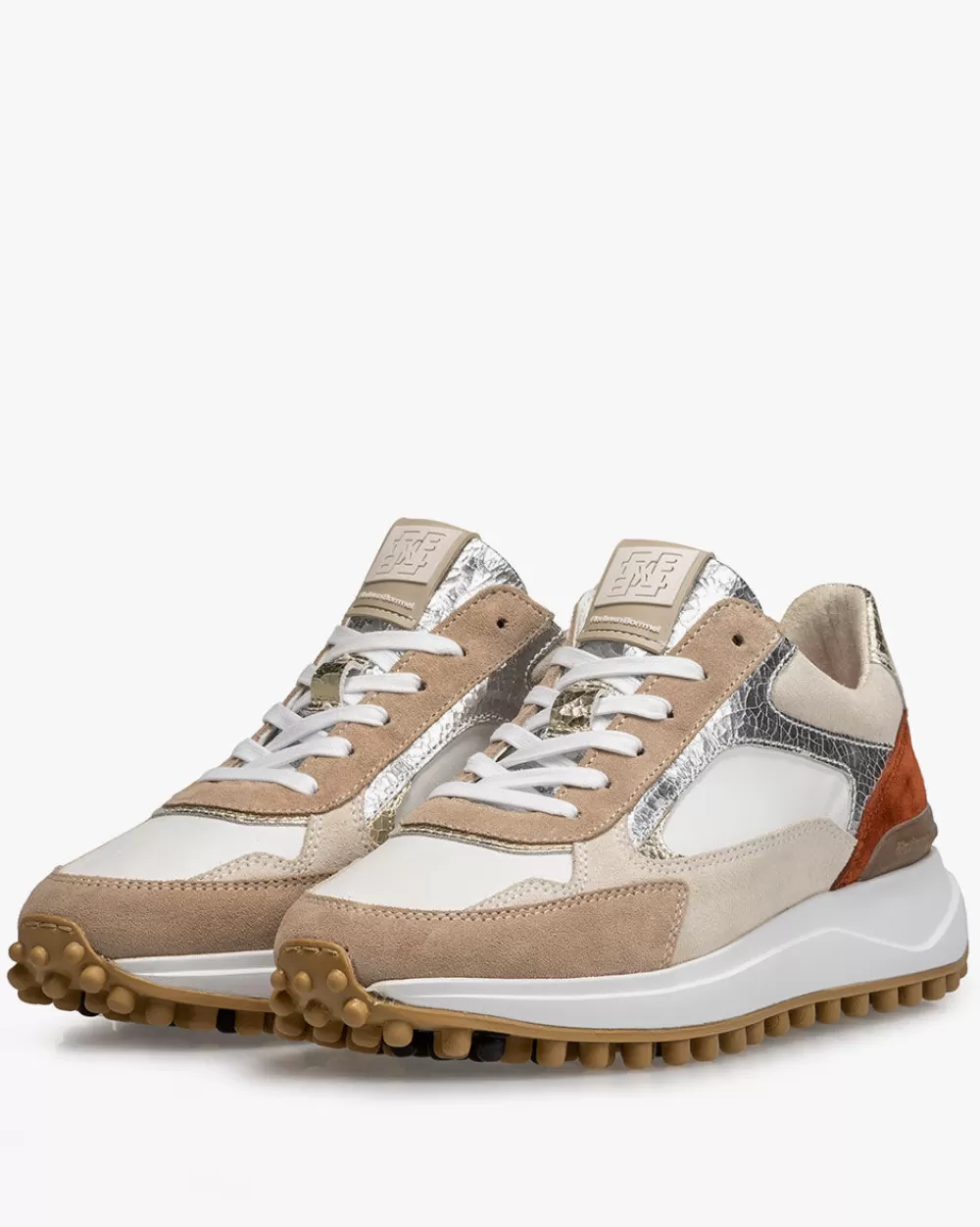 A modern classic in our collection: The ”De Noppi” sneaker. The lightweight sole is made of durable TPU with a distinctive nub profile. The nubs have a colour pattern that give the sole an even more unique look. The carefully designed last, the premium leather lining and the removable footbed provide high wearing comfort. This version is made of taupe-coloured suede combined a silver metallic print. The FXB logo, which is worked into the rubber tongue label pays tribute to Floris’ great-great-grandmother, who also manufactured shoes over a hundred years ago.